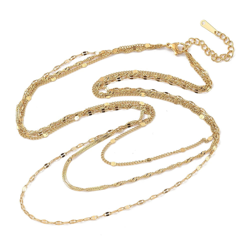 Descubre la elegancia y resistencia de esta cadena de tres capas, fabricada en acero inoxidable 304 y chapada en auténtico oro de 18k. Con 16 ½ pulgadas (42 cm) de longitud, es la joya perfecta para destacar tu estilo con un brillo duradero y sofisticado. Añade un toque de lujo que resiste el paso del tiempo y realza cualquier outfit con confianza. Hazla tuya y luce impecable en cada ocasión.